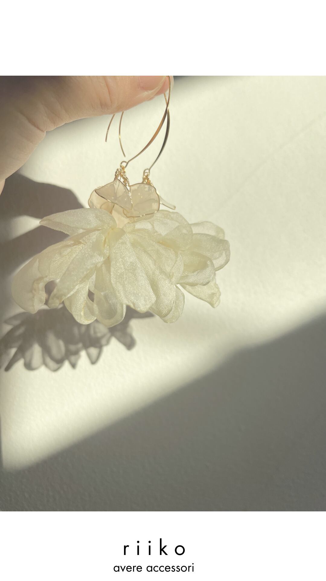milky flower と ふわふわ揺れるシフォンリボンのブライダルアクセサリー。